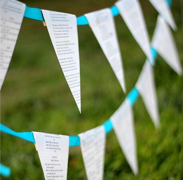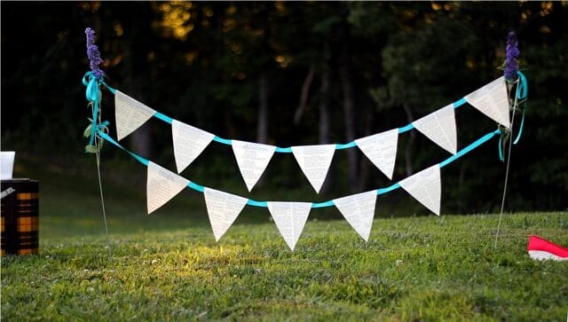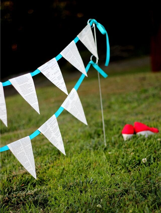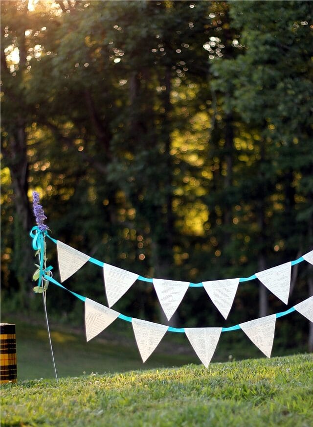 Instead of a fabric bunting, this is made from book pages and ribbon, so it is a completely no-sew project. Simply find a book that is no longer used for reading (you can find plenty of beat-up books at the thrift store), remove pages from the book, and then cut out the shape you need for the bunting pennants. For the kind of bunting I made here, it’s just a triangle with the top side extended and reshaped to be able to fold over the ribbon and still have enough overlap past the ribbon to have a gluing surface to hold it together. Then just spread glue on that top edge, and fold each bunting piece over the ribbon – and you have your bunting! I made two lengths, because the sign posts have two loops, and I liked the idea of a double layer. Stick the sign posts in the ground, and tie on the bunting. If you want to make the metal loops less noticable, you can just weave something decorative through them – for instance, I used a couple long stemmed flowers:
