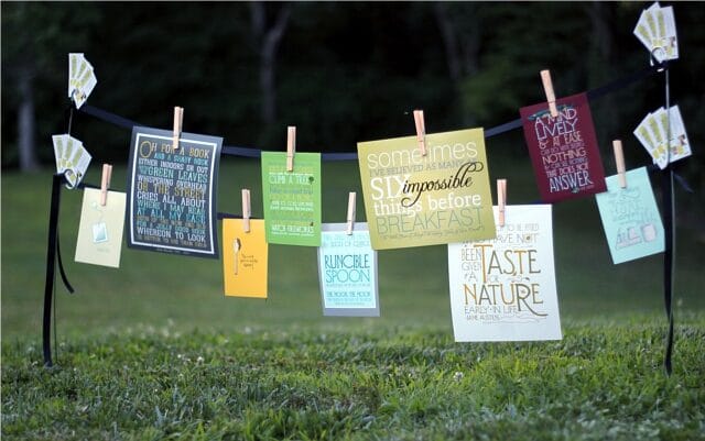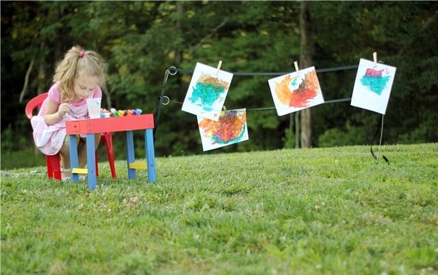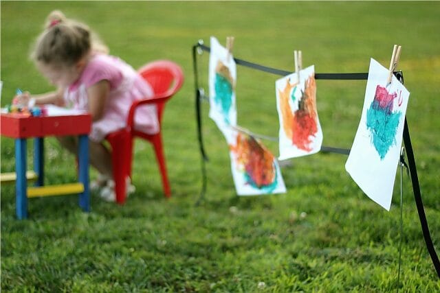 My little one loves to paint. Our apartment has carpet in every single room – and in most rooms, very light carpet. So basically any painting has to happen outside! Which is a lovely place to paint, of course, but the main problem is that the wind likes to sweep away the freshly made masterpieces. But stick a couple sign stakes in the ground, tie on some ribbon, gather art supplies and invite some other kids over to have a painting party! Display the new paintings, as they dry, by attaching them with clothespins to the ribbon. Depending on how many kids you have, you may want more than one “drying rack”, but the good news is that they are so cheap to make.