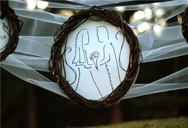 One of the things I learned in getting ready for our wedding, almost six years ago, was that anything labelled “wedding” or “bridal” automatically cost twice as much as the same exact item not labelled “wedding”. For instance, white wedding table cloths vs. just white table cloths. There may be no discernible difference between them except for the fact that one has the word wedding on the label, but it’s generally going to cost a lot more. As a result, I found that buying non-official-wedding-items-that-were-still-white-and-looked-just-like-wedding-items and using them for the wedding was a lot more cost effective. The same idea struck me with these. Now I’m sure you would want to disguise them or paint them, but at an outdoor wedding (like mine was) I imagine the stakes in the ground with swags of tulle going back and forth, with bows at either side, and maybe a sign hanging in the middle that says “Seating this way” or “take a program”, and have a basket of programs next to it, etc. For this particular example, I recreated a quick version of the illustration I made for our wedding invitations and attached it to the back of a light-weight willow wreath, and hung it in front of sways of tulle. Unfortunately the light was failing as I was working on this last night, and so I didn’t get a decent shot of the whole thing, but I’m sure you get the picture. Here is a shot, though, of the “framed” illustration hung between the sign stakes: