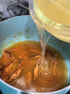 Add the chicken broth and stir until the curry paste dissolves.