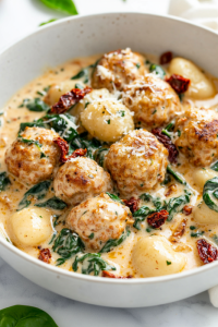 Slow Cooker Tuscan Chicken Meatballs with Gnocchi is a comforting, flavorful dish featuring tender chicken meatballs simmered in a creamy, garlicky broth with sun-dried tomatoes and spinach. The slow cooker enhances the richness while gnocchi soaks up the sauce, creating a satisfying, restaurant-worthy meal with minimal effort.4