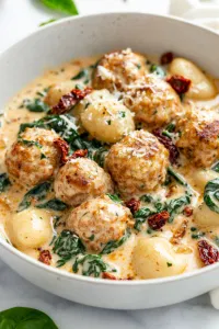 The meatballs stay tender, the sauce turns silky, and the gnocchi finishes everything off without extra pans.
