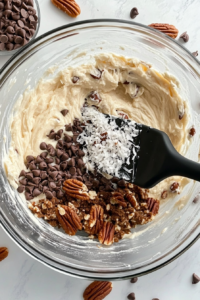- Stir in vanilla, then gently fold in chocolate chips, chopped pecans, and shredded coconut.