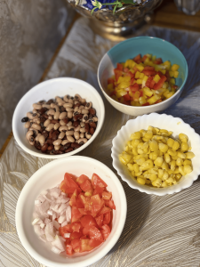 - To the bowl of dressing, add diced bell peppers, roasted red peppers, jalapeños, drained black beans, black-eyed peas, corn, chopped tomato, and the rinsed onion.