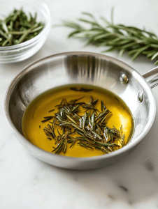 - Heat the remaining 1 tablespoon of olive oil in a skillet over medium heat. Add the chopped roasted rosemary leaves and cook for about 30 seconds until fragrant. Remove from heat.