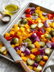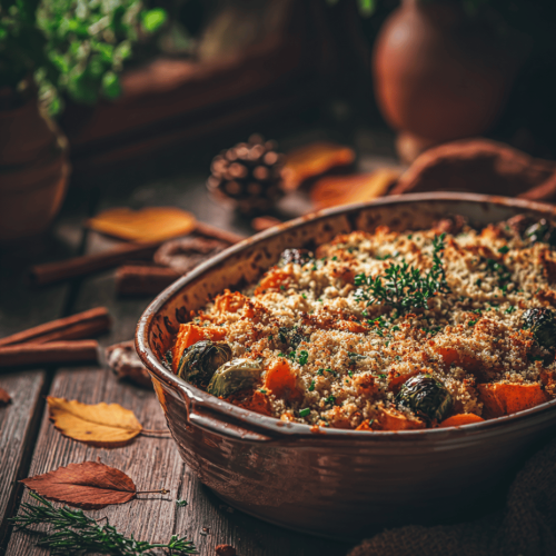 Start by preheating your oven to 200°C (400°F) and lining a baking sheet with parchment paper. Prepare your vegetables—peel and dice sweet potatoes into 1-inch cubes, toss with olive oil, salt, and thyme, then roast for 25-30 minutes until tender and caramelized. In the meantime, trim and halve Brussels sprouts, tossing them with olive oil, salt, and smoked paprika, then roast for about 20 minutes until crispy on the edges. While the vegetables cook, melt butter in a small skillet and toast panko breadcrumbs with sage until golden and fragrant—about 3 minutes.