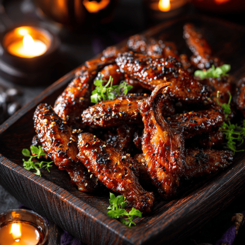 These bat-shaped wings are not just a visual treat—they’re packed with flavor. The soy sauce glaze caramelizes during cooking, giving the wings a deep umami flavor profile, balanced by the sweetness of honey or brown sugar. The garlic and ginger add layers of aromatic warmth, while the marinade tenderizes the meat, ensuring each bite is juicy and flavorful. Serve these wings hot with a side of spicy dipping sauce, pickled vegetables, or even a simple crisp salad for a well-rounded Halloween feast.