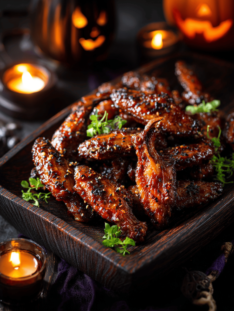 Assembling the Halloween Bat Wings is the fun part. Once cooked, arrange the wings on a serving platter. Use the olives to create the bat’s “ears” and eyes, either placing them directly on the wings or attaching them with a dab of sauce or toothpick for stability. For the wings’ “wings,” you can gently fold or fan out the chicken to mimic bat wings, which adds a playful, three-dimensional effect. To make the presentation even more festive, sprinkle sesame seeds or chopped scallions over the wings for added texture and color.