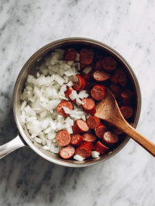 - While the pasta cooks, heat 2 tablespoons of olive oil in a deep skillet over medium heat. Add the chopped onion and minced garlic, sautéing until fragrant and golden, about 2-3 minutes. The aroma should be warm and inviting.