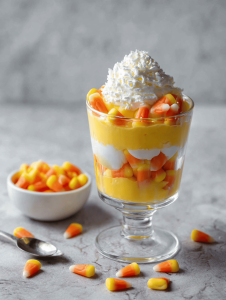 - There’s a messy joy in stacking bright candy corn with smooth pudding. No perfect layers, just fun.