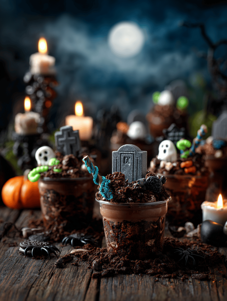 - Once chilled, your creepy graveyard pudding cups are ready to serve. Enjoy the playful, spooky scene and creamy, crunchy textures with friends and family!