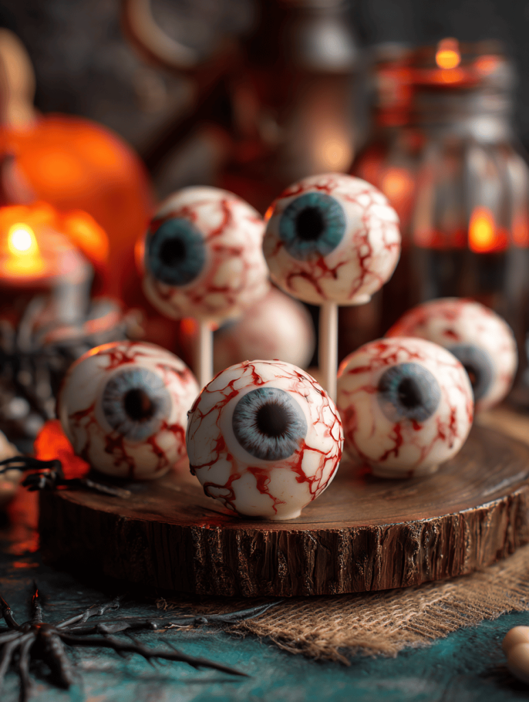 Once set, let the eyeballs sit at room temp to avoid condensation. Stick them on a platter or in a foam block for display. They’re best eaten within 24 hours, when everything stays fresh and glossy.