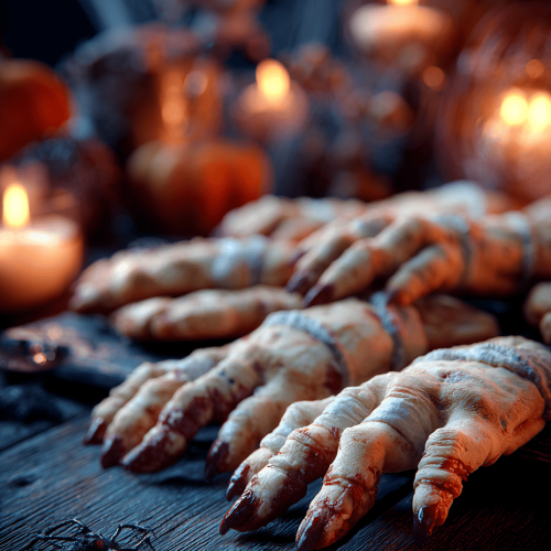 - Place a slivered almond at the tip of each finger to resemble a creepy nail. Dab a tiny amount of red food coloring around the base for a bloody effect, if desired.