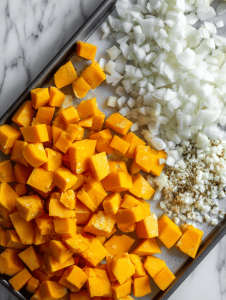 2. Peel, seed, and cube the squash. Toss with 2 tbsp olive oil and spread out. Roast 40-45 mins, until edges are deep amber and flesh is tender. The smell should be sweet and smoky.