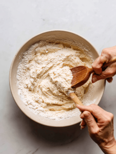 - Gradually add the dry ingredients to the wet mixture, stirring gently with a whisk or spatula until just combined—lumps are okay, don’t overmix.