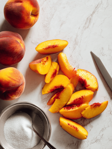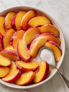 - Peel the peaches if you prefer, then slice them into the prepared dish. Toss the peaches with 2 tablespoons of sugar, a pinch of cinnamon, and a splash of lemon juice. Let them sit for about 10 minutes until the juices start to flow and the fruit softens slightly.