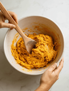 - In a large bowl, whisk together pumpkin puree, melted butter, and brown sugar until the mixture is smooth and fragrant with warm spices.