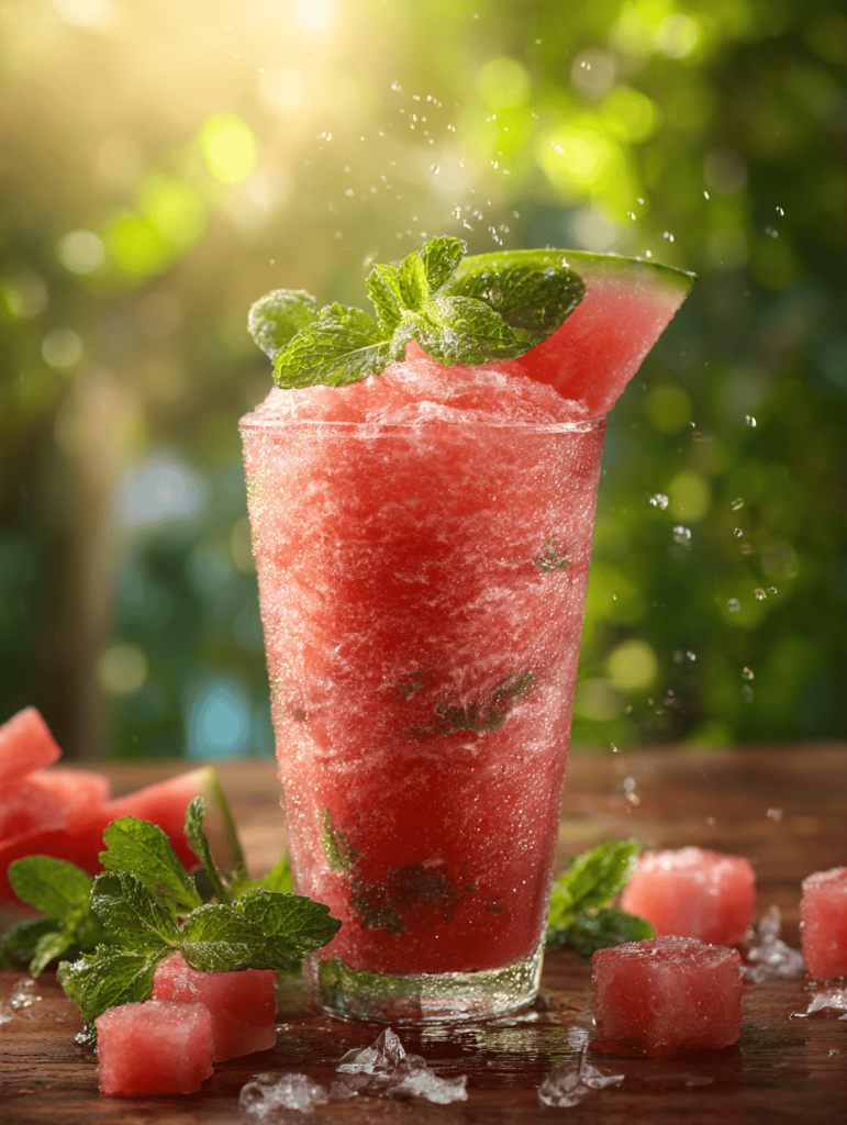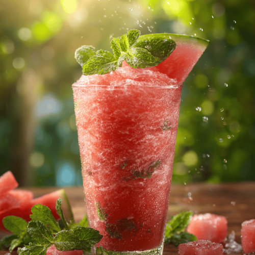 Pour into chilled glasses, garnish with a sprig of mint or a small wedge of watermelon. Serve immediately for the best icy texture. If making in advance, freeze briefly and give a quick stir before serving.