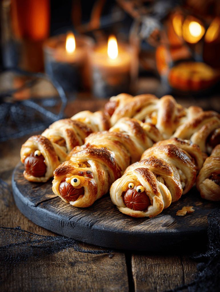 - Serve your spooky, crispy mummy hot dogs immediately, enjoying the crispy pastry, melted cheese, and fun, monster-like appearance.