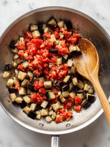 - Return the fried eggplant to the sauce and stir gently to combine, allowing the flavors to meld further for a couple of minutes.