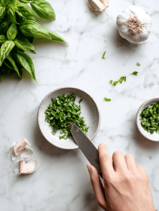 – Garlic: Plenty of minced garlic—about four cloves—sizzles in hot oil, filling the kitchen with a pungent, inviting aroma.