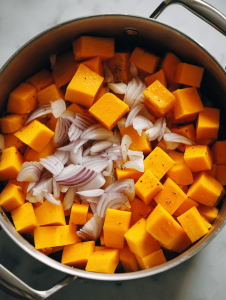 - Once the pumpkin is roasted and cooled slightly, add the chunks to the pot with the sautéed onion and garlic. Cook together for a few minutes, allowing the flavors to meld and the pumpkin to release its smoky aroma.