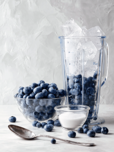 - Place your blueberries into the blender, whether fresh or frozen, ready to burst with color and flavor.