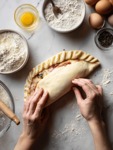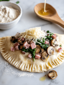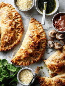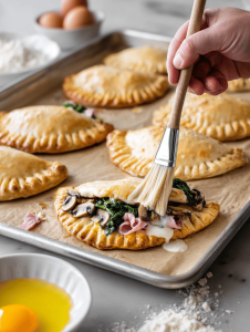 - Transfer the filled calzones to the prepared baking sheet. Brush the tops with beaten egg for a shiny finish.