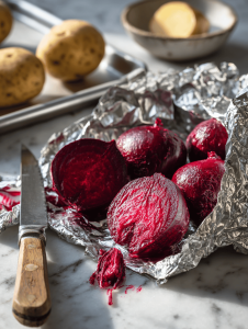 - Preheat your oven to 200°C (390°F). Wrap the beets in foil and roast for about 45 minutes, until they’re soft and a little oozy inside. This roasting process develops their smoky sweetness and vibrant color.