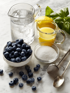 - Gather all your ingredients: blueberries, lemon juice, sugar, water, ice, and basil leaves.