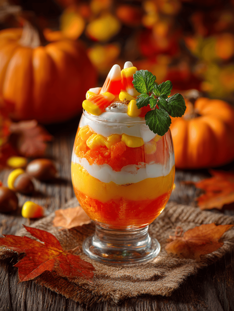 - Candy corn: Sweet, chewy, iconic fall candy. Use mini versions for easier layering.