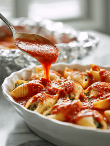 - If desired, pour spicy tomato sauce over the shells to add a fiery edge, or leave the shells plain for a milder flavor. Cover the dish with foil.