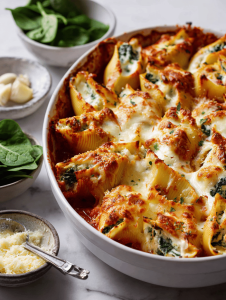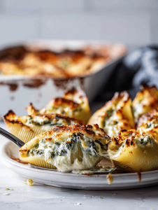 - Using a spoon or piping bag, generously stuff each shell with the cheese mixture. Place the filled shells seam-side down in the prepared baking dish.