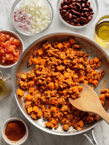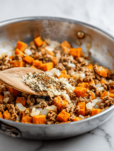 - Stir in the diced sweet potatoes, ensuring they are coated with the spices and mixed well with the meat. Cook for 2-3 minutes, allowing the flavors to meld.
