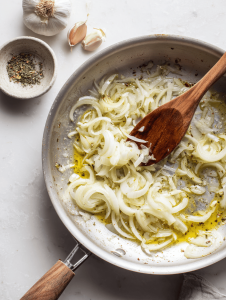 Step 2: Add a splash of oil, then sauté diced onions and garlic until fragrant, about 5 minutes.