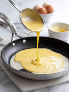 • Heat a non-stick skillet or crepe pan over medium-low heat, around 160°C (320°F). Lightly grease the pan with a small amount of butter or oil to prevent sticking and ensure even browning.