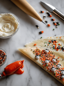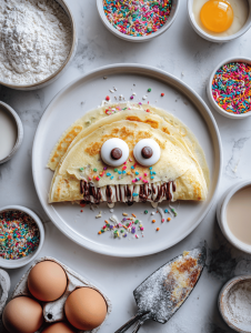 • Decorate the crepes with edible eyes, sprinkles, or icing to craft spooky faces and scenes, making each one playful and festive.