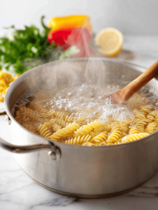 Step 2: Add 400g (14 oz) of pasta—fusilli or rotini work great for catching dressing and bits—cook until al dente, about 8-10 minutes.