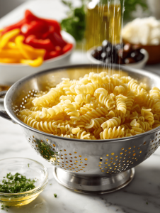 Step 4: While the pasta cools, prepare your toppings and dressing to keep everything ready for assembly.