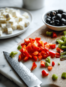 - While the pasta cools, dice the bell pepper into small, crunchy pieces and prepare the cheese cubes, slicing olives if necessary.