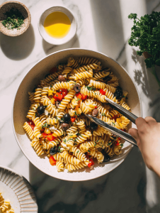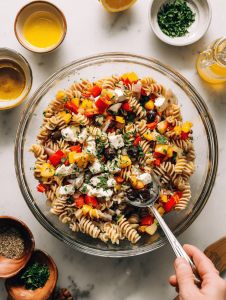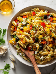 - Colorful pasta: Vibrant fusilli that catches dressing and adds fun swirl effects.