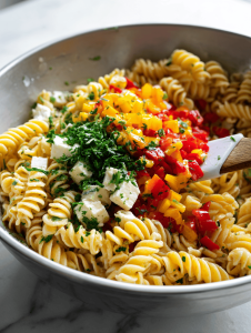 - Add the diced bell peppers, cheese cubes, sliced olives, and chopped parsley to the pasta. Carefully fold everything together to combine, ensuring the ingredients are evenly distributed.