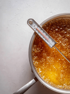 - Bring the mixture to a boil without stirring, watching for the color to deepen to a rich amber. Use a candy thermometer to monitor the temperature, aiming for 150°C (300°F) — the hard crack stage.