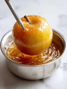 Step 5: Quickly dip each apple into the hot toffee, tilting the pan to coat evenly. Let excess drip off.