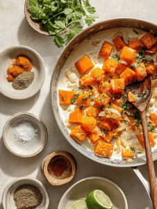This pumpkin curry is a cozy, flavorful dish that combines tender pumpkin chunks simmered in a fragrant coconut milk and spice mixture. The dish has a rich, velvety texture with a bright orange hue, finished with fresh cilantro and lime for a fresh, vibrant touch. It’s perfect served over rice or with your favorite bread for a comforting meal.