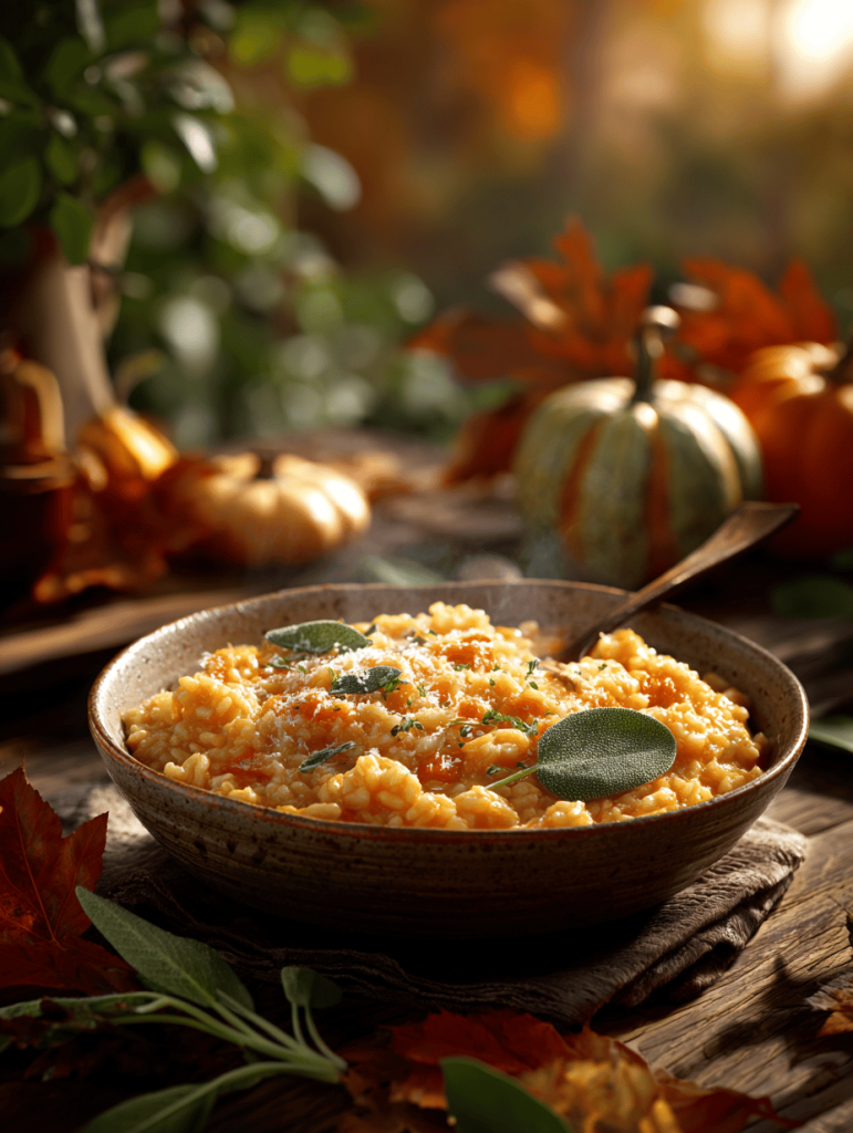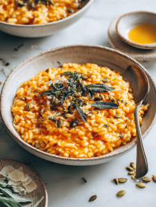 - Serve the pumpkin risotto hot, garnished with the crispy sage leaves and toasted pumpkin seeds for added texture and flavor.