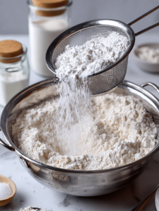 - Sift the flour, sugar, baking powder, and salt into a large mixing bowl. This aerates the flour and ensures an even distribution of ingredients.