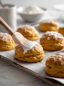 - Place the cut scones onto the prepared baking sheet, spacing them evenly. Brush the tops lightly with a little extra cream and sprinkle with sugar if desired for a sweet finish.
