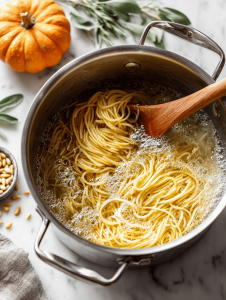 - While the pumpkin roasts, bring a large pot of salted water to a boil and cook the pasta until al dente, following package instructions. Drain and set aside.
