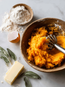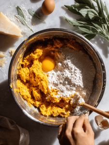 - Gradually add flour to the pumpkin mixture, folding in gently. Continue until the dough is soft but manageable; add more flour if it’s too sticky, but avoid overworking to keep the gnocchi tender.